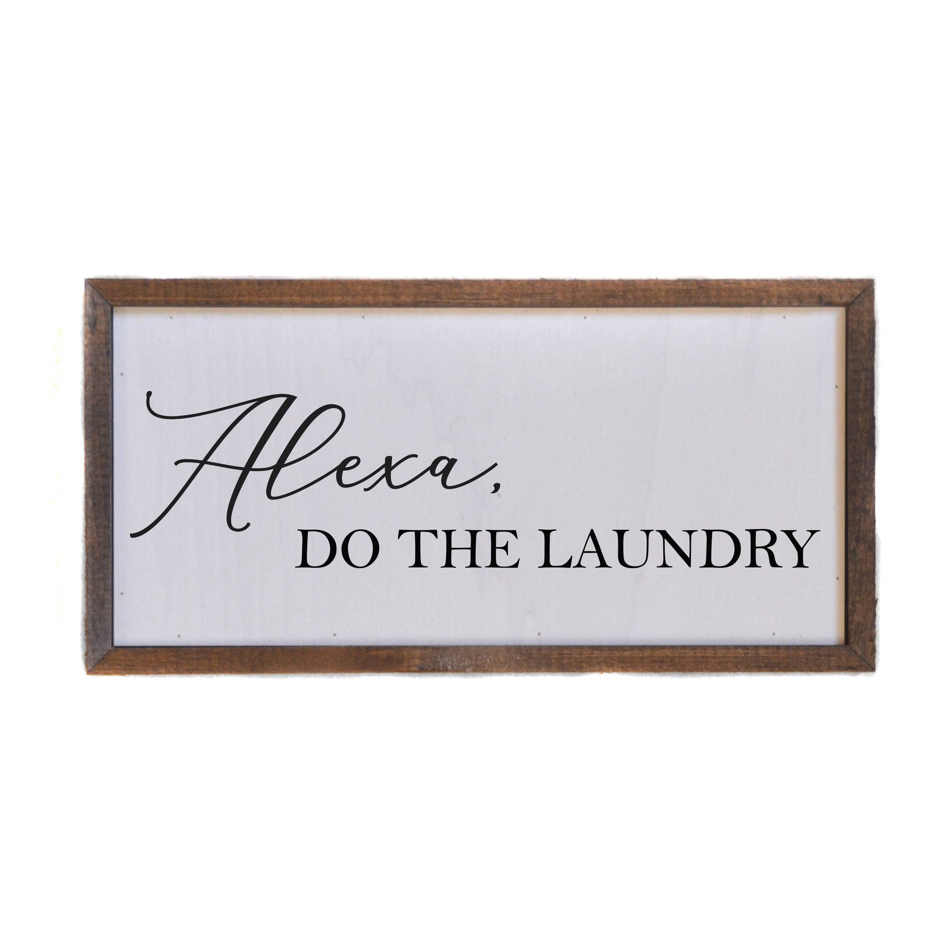 12x6 Alexa, Do The Laundry Wall Sign or Desk Sitter. All our signs are build into a wooden box frame with a rustic touch. Signs are hung directly off the frame or will sit on a shelf.