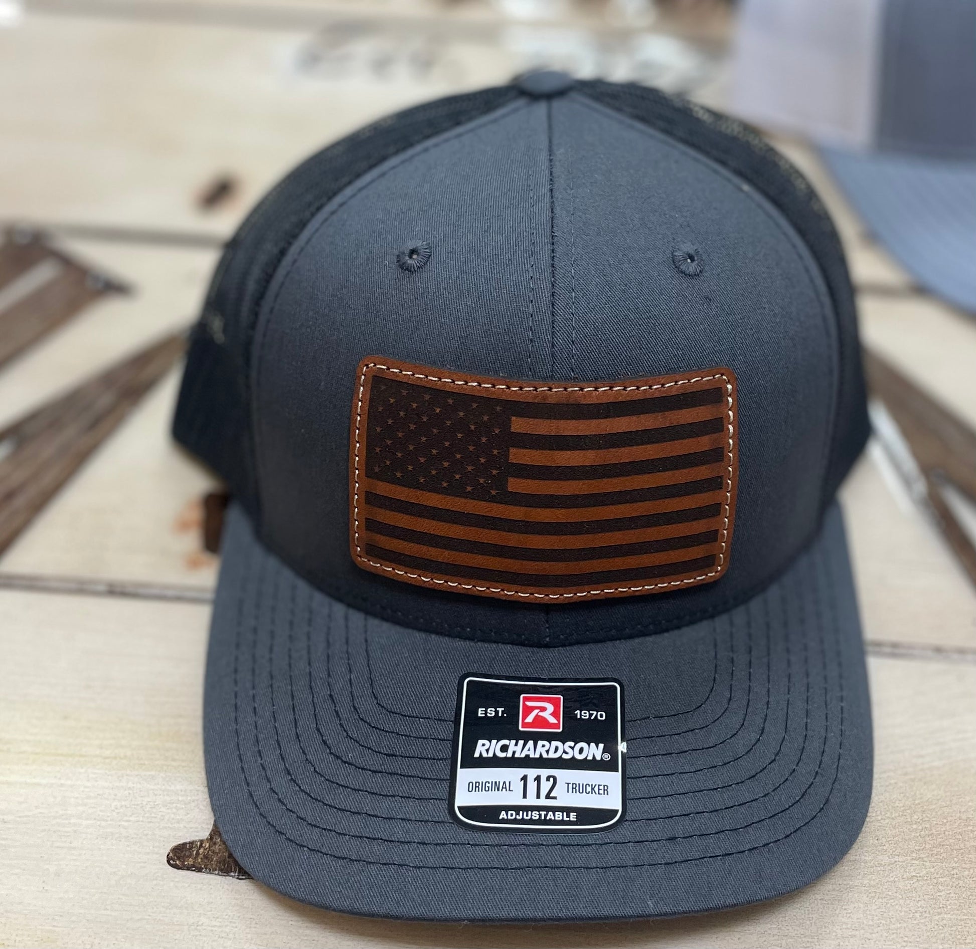 Fine Leather Patch Hat with an American Flag Design Richardson 112 Trucker Style snap back hat - Message us for available color options!