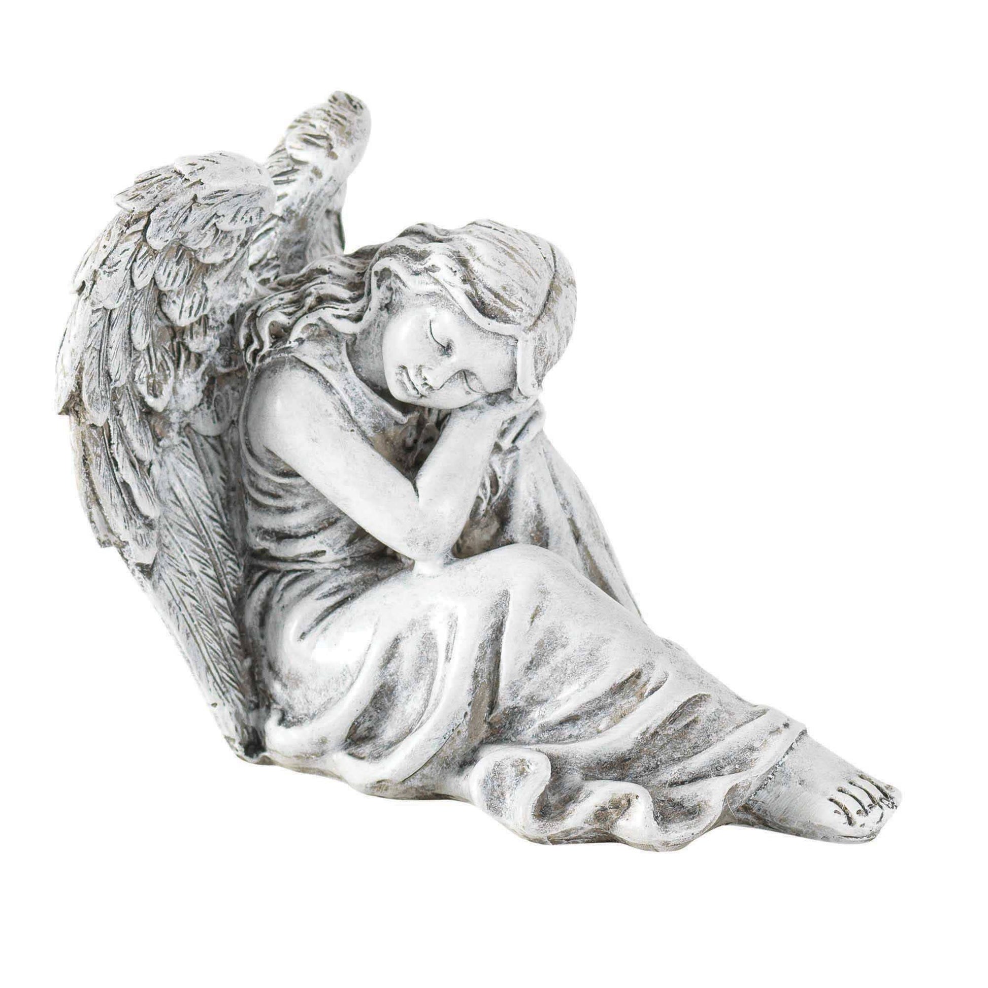 This exquisitely detailed garden angel figurine provides a peaceful and comforting presence wherever it is placed. Makes a thoughtful gift for bereavement, or any occasion. Made of resin with stone color finish. Size is about 4" tall X 5 1/4" long X 3 1/4" wide.