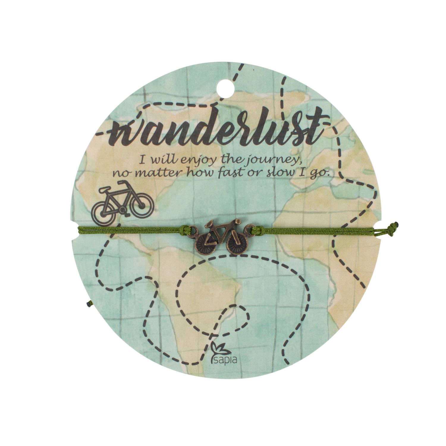 Not everyone has a need for speed. Some of us enjoy the ride no matter how slow we go! The Bicycle Charm Bracelet is a great reminder to find joy in the journey. This bracelet is handmade by the artisans of Sapia. Pewter charm on green acrylic cord on paper card - “I will enjoy the journey, no matter how fast or slow I go.“ printed on front of card - Cord measures 4L inches (on each side of charm), charm measures 0.75Lx0.5H inches - Adjustable knot closure - Handcrafted in Colombia