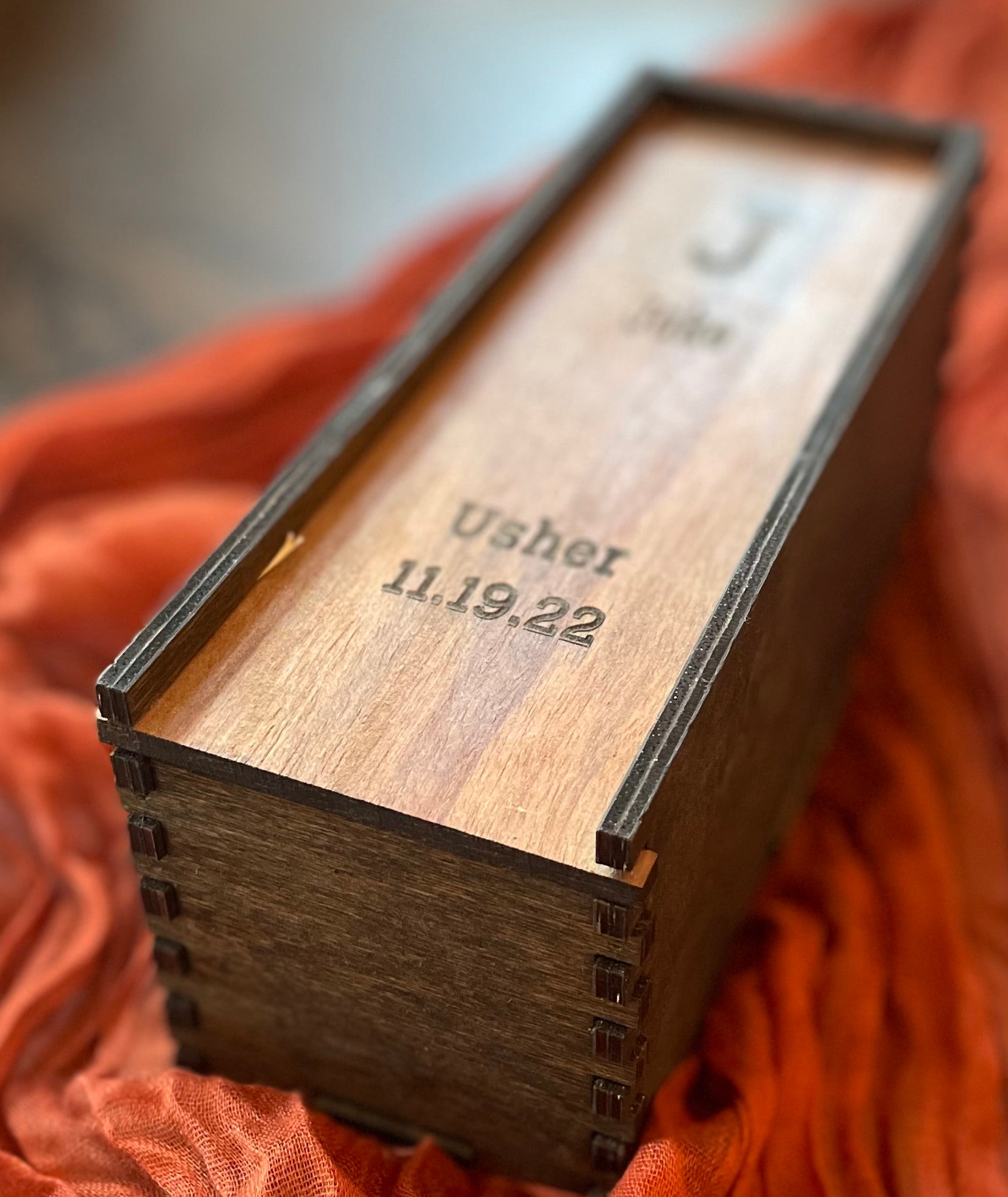 Our Groomsmen Gift Boxes are cut by a laser machine for extra strength and finished in a Walnut stain. Add a good cigar and a bottle of Bourbon and you have unique inexpensive way to ask your groomsman. The keepsake favors they will be able to use long after the big day.