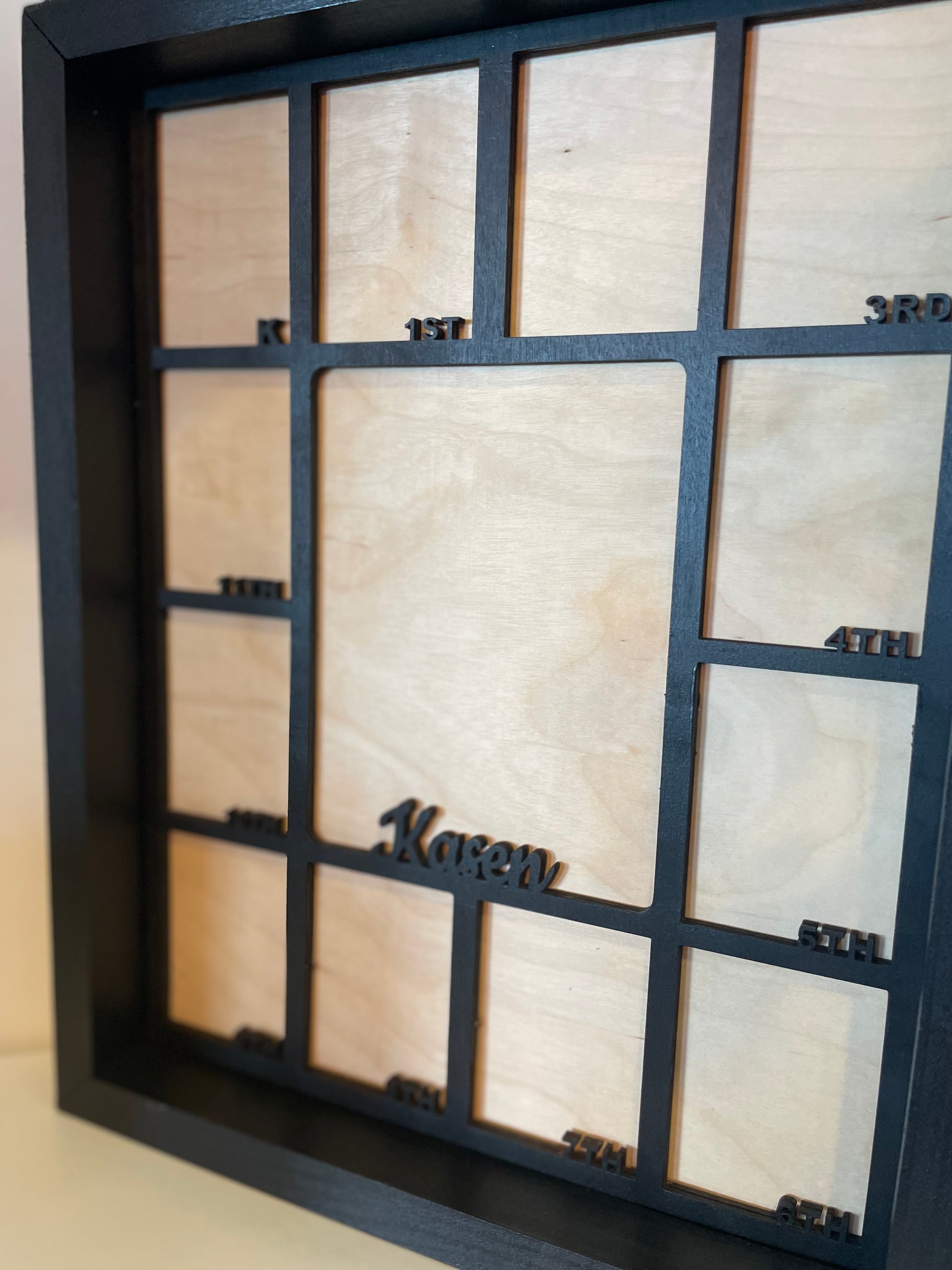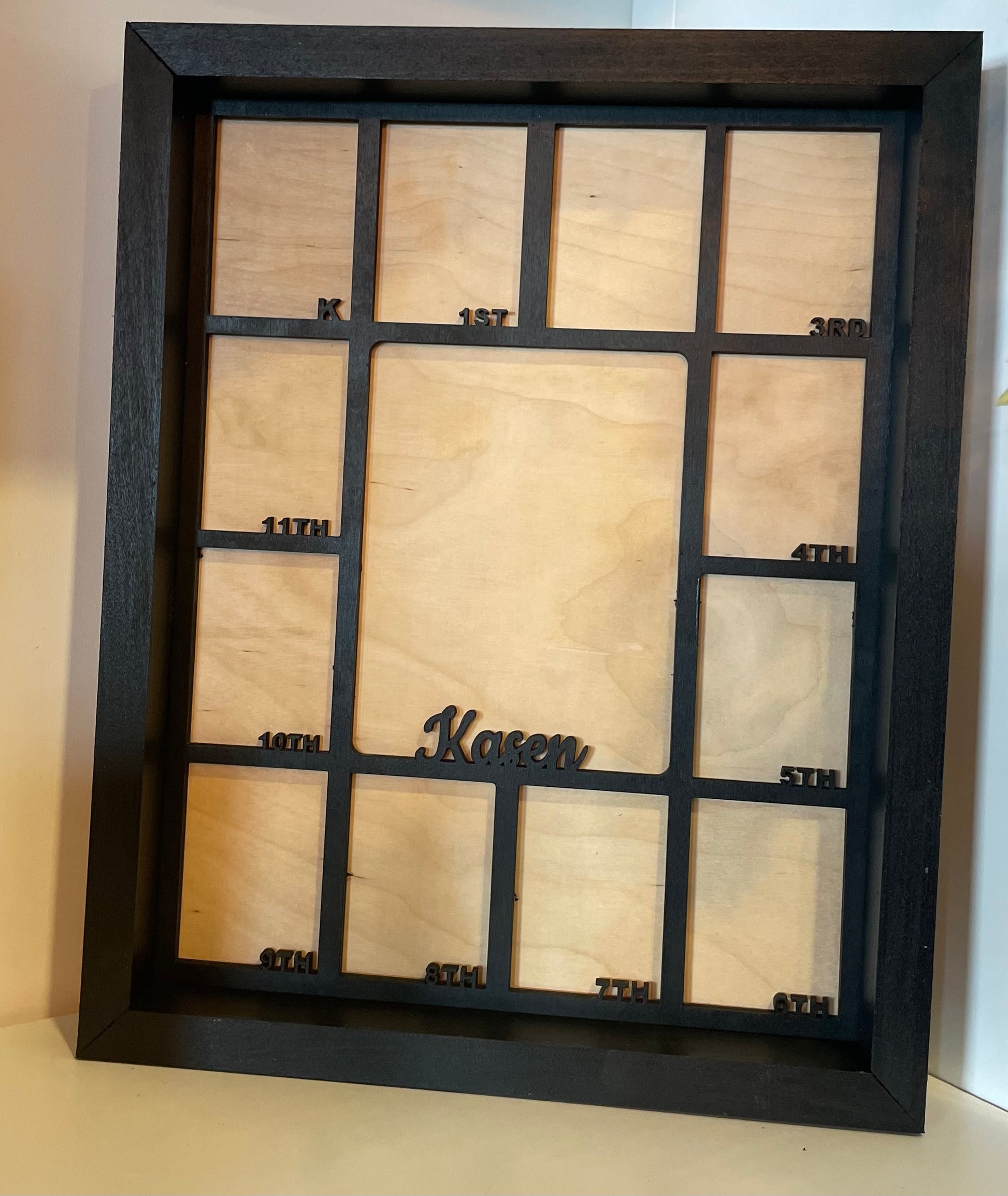 Showcase your child's official school photo in a beautiful custom-made picture frame. Your child's photo will be featured prominently in a tasteful and stylish setting, making it the perfect keepsake for years to come. Personalize it with the name you want. Holds 13 photos. glass is not included. 11x14