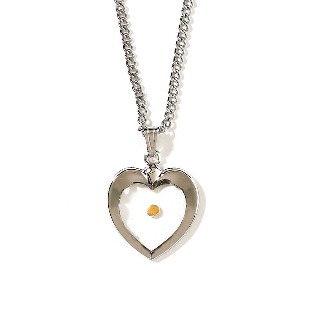 Faith even the size of a mustard seed can move mountains. Remember Jesus’ words in Matthew 17:20 whenever you wear this necklace that holds a real mustard seed. Silver plated 5/8” open heart pendant on 18” silver plated chain. Deluxe gift box with anti-tarnish paper and care instructions.