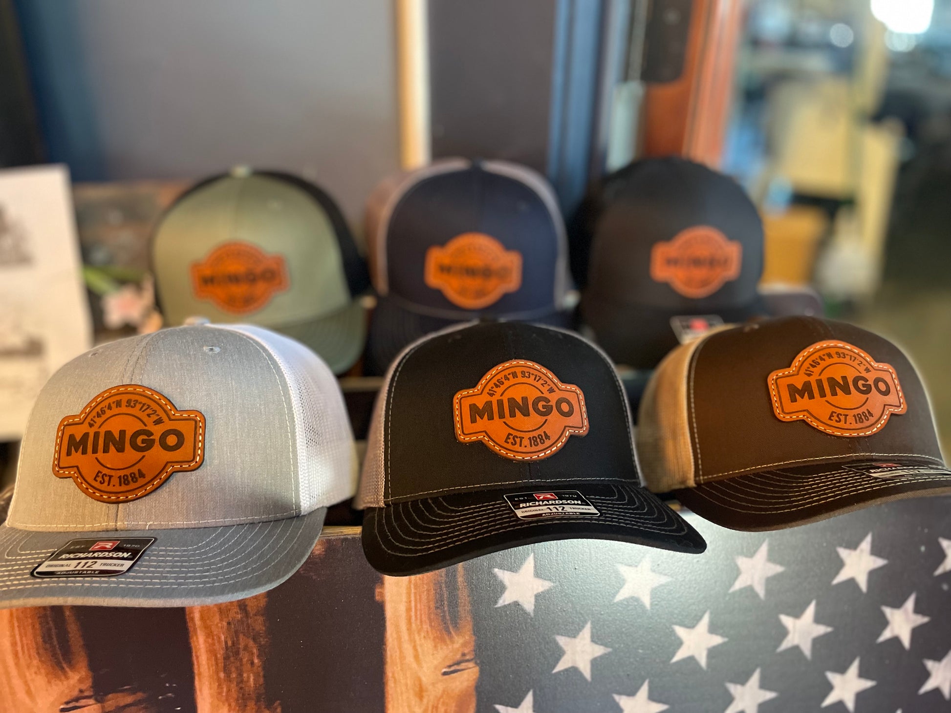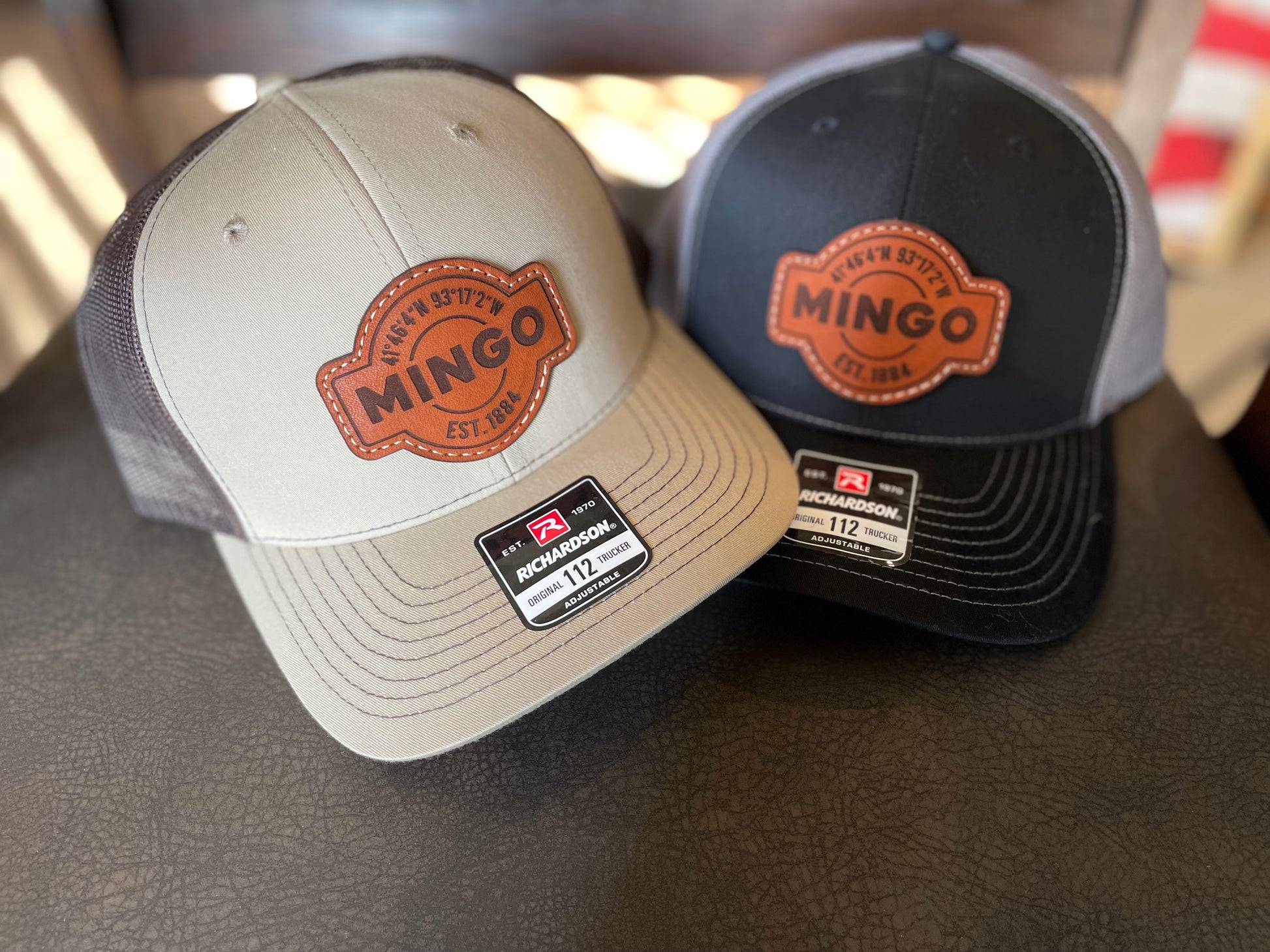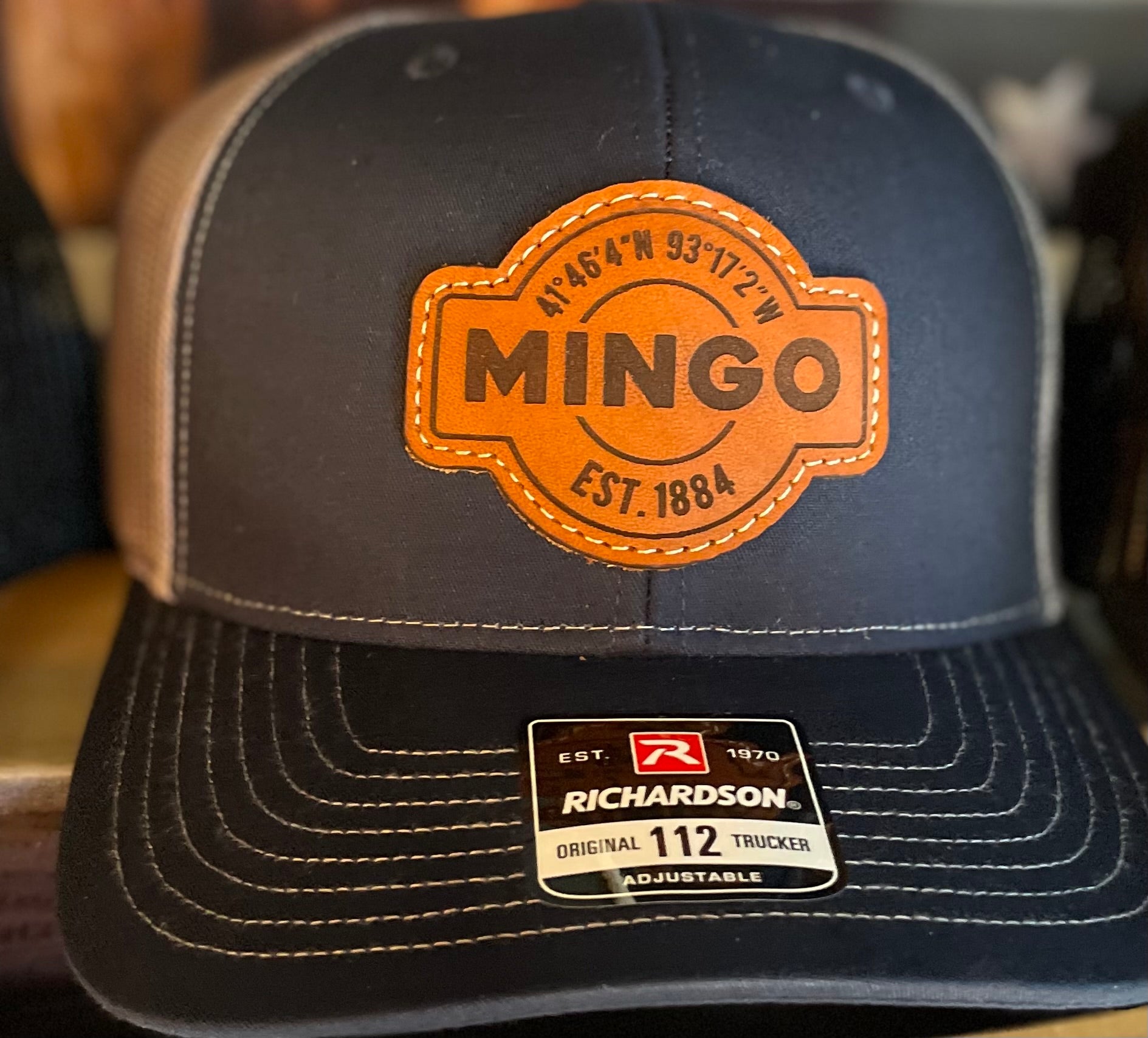 Fine Leather Patch Hat with an Mingo Iowa Design Richardson 112 Trucker Style snap back hat - Message us for available color options!