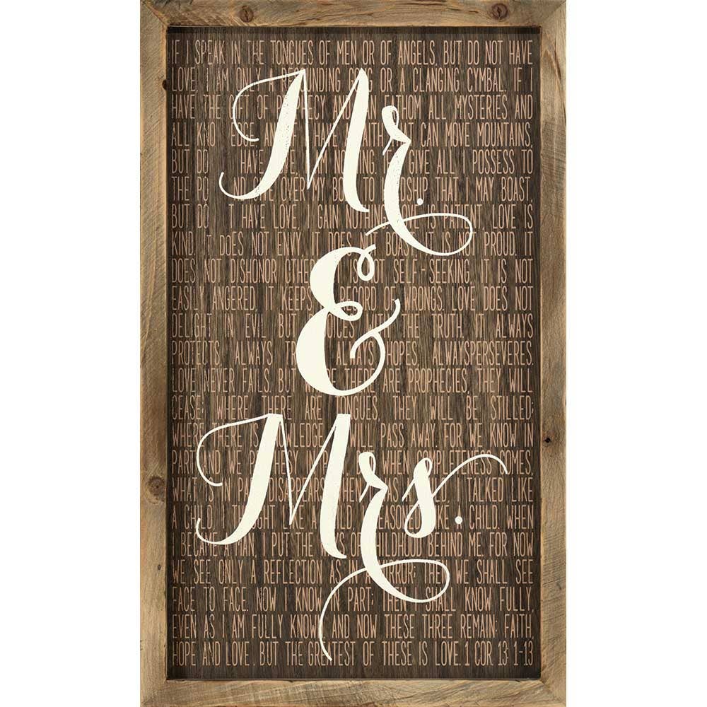 Beautiful as a wedding or anniversary gift, this framed wall plaque features a calligraphy Mr. & Mrs., arranged over the first 13 verses of the Bible's Love Chapter, 1 Corinthians 13. Background is a woodgrain design. Size is 9 1/2" wide x 15 3/4" high, with a depth of 1". Sawtooth hanger. Made of MDF, a high quality wood material with a smooth surface.