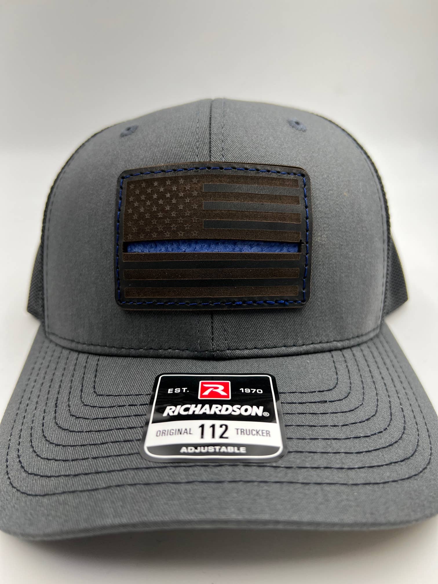 Back the Blue with this American Flag patch! Unique Design on Fine Leather Patch, accented with a blue pigskin stripe and blue stitching. Richardson 112 trucker style snapback hat with Charcoal front, and BLACK mesh Current production time is 2 week - *Keep in mind leather color will vary depending on each cowhide*