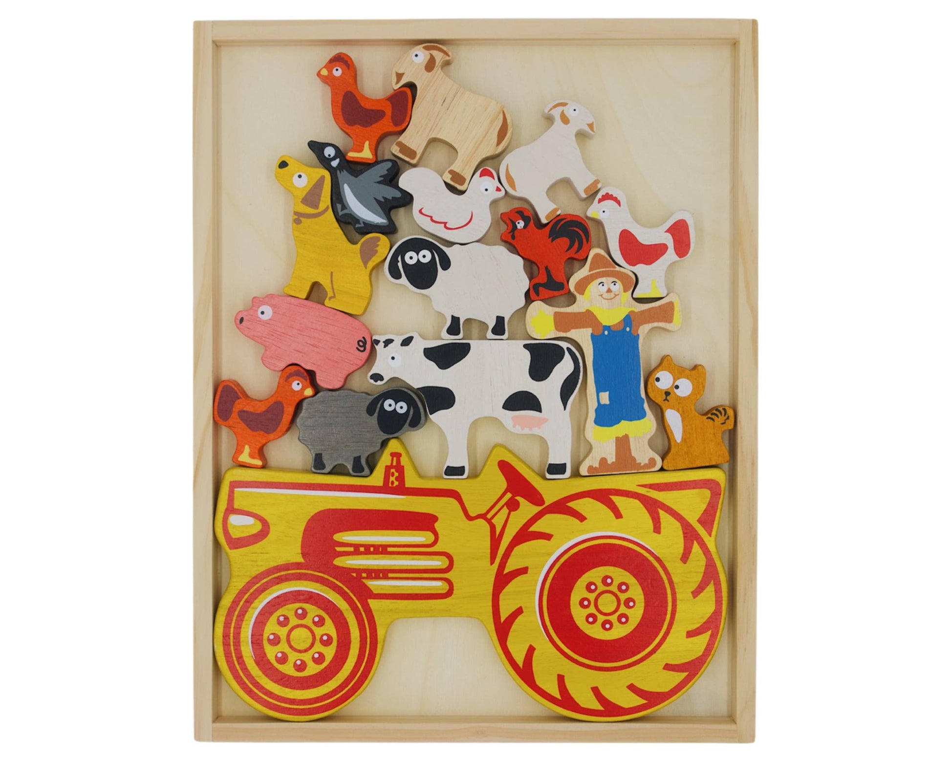 The Tractor Stacker is a family game and character playset all in one! With the Tractor Stacker game kids can develop dexterity, patience and pretend play skills. Inventing their own games and stories, kids will stack the brightly colored farm animals as high as they can, balancing them atop the 6"x10" wooden tractor. The farm animals are also perfect pocket pals, starring daily in pretend barnyard adventures. Made from eco-friendly rubber wood with non-toxic, child-safe stains.